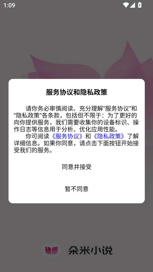 1、下载并安装朵米小说应用程序,该应用程序在整个过程中都是无广告的,为您提供了一个干净的阅读环境。同意隐私协议。