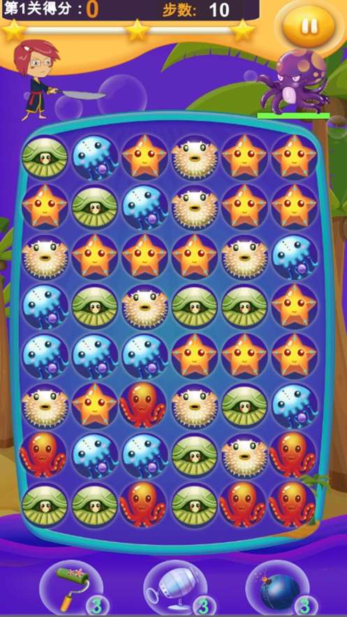 1、有海龟,海星,小章鱼,水母等海洋里的小动物元素,大家可以根据游戏关卡提供的步数来完成任务;