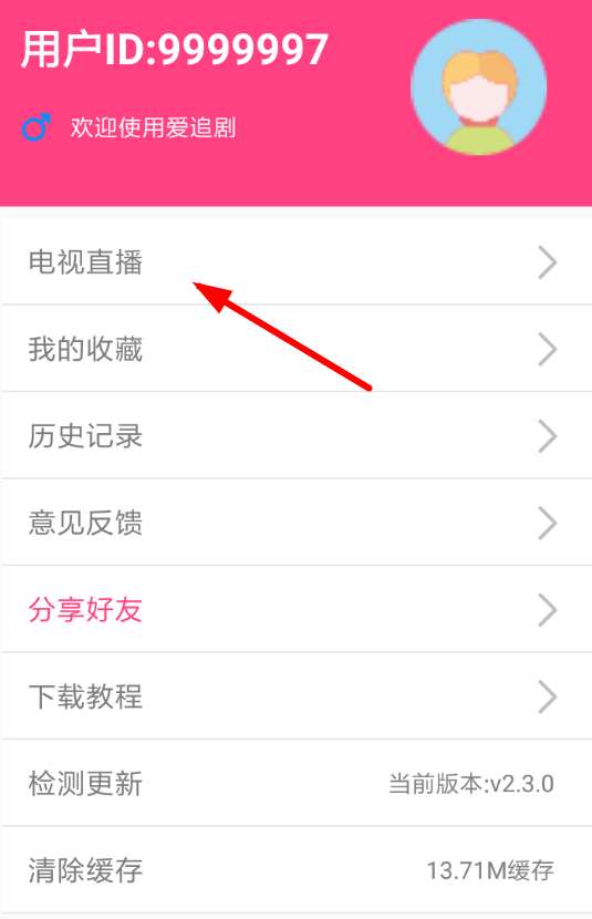 1、由于爱追剧里的电视直播观看入口比较隐蔽,用户需要先通过首页右侧的头像按钮进入个人中心(如下所示),才能找到所需的服务。