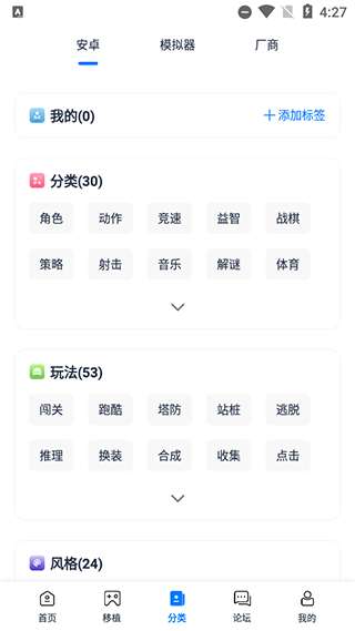 2、分类,包括安卓、模拟器以及厂商等分类外还细分为玩法、风格等多个分类,是找游戏的使用工具。