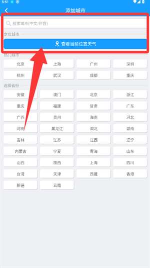 1、前往添加城市页面,点击查看当前位置的天气信息。