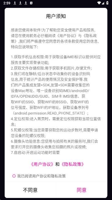 1、同意用户协议,进入app。