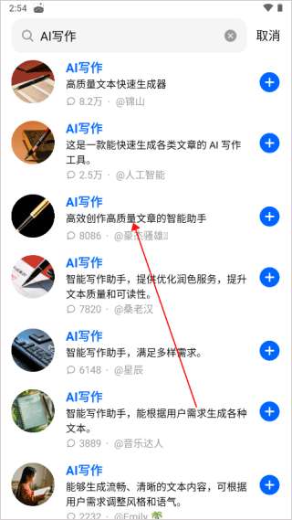 3、如输入AI写作,即可出现相关的AI智能体。