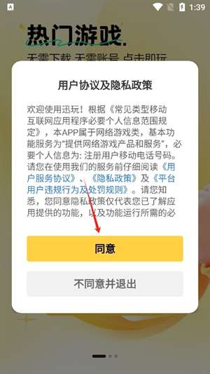 1、打开迅玩云游戏app并同意用户协议。