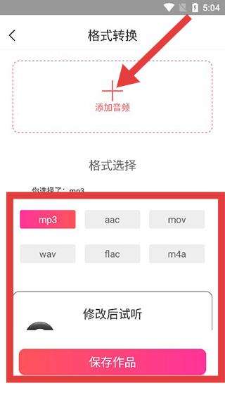 2、文字语音转换助手软件格式转换页面,有添加音频区域,可点击添加文件,下方提供多种格式选项,设有修改后试听和保存作品按钮,便于用户转换音频格式。