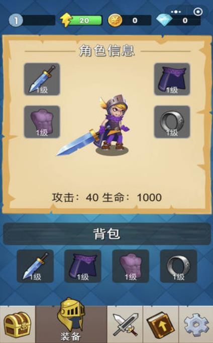 2、在这里可以点击装备对你的角色进行物品的更换以及升级,可以看到他的信息,比方说攻击力,生命值。