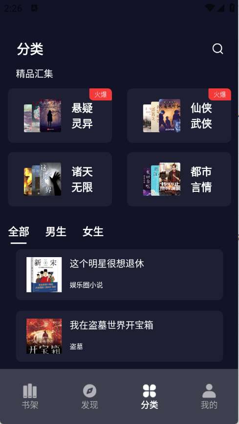 夜班小说阅读器是一款热门的在线看书阅读平台,拥有全新的小说界面设计,可以在里面找到很多高人气的小说作品,还提供男频小说和女频小说,允许用户自由选择查看,轻松关注热门小说书籍的更新,随时随地在线阅读看书,能完全满足所有阅读需求,还具有个性化的小说书架,用户可以直接收藏喜欢的小说并轻松管理,免费阅读喜欢的小说书籍和最新内容,自由享受优秀的追书阅读乐趣,有兴趣的用户欢迎下载软件。