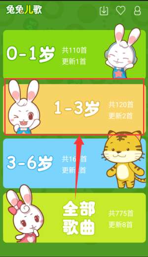 2、选择合适的年龄段,如1-3岁,浏览相应的歌曲列表。