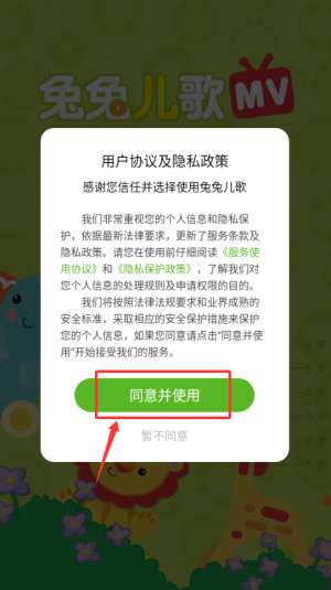 1、在兔兔儿歌APP中点击“同意并使用”,进入程序主界面。
