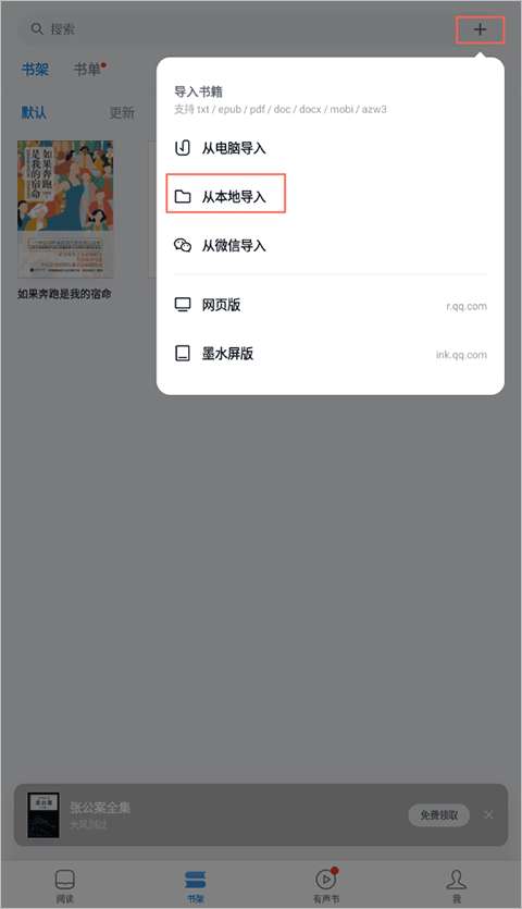 1、登录微信读书app后,在书架页面点击右上角的“+”号,选择其中的“从本地导入”。