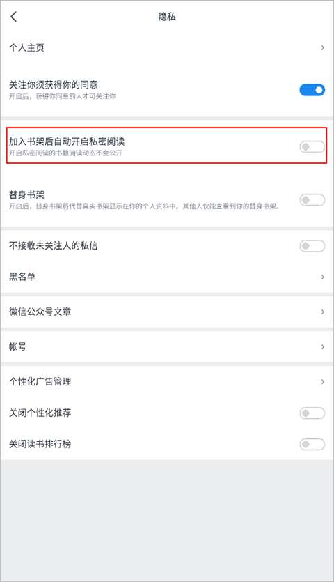 3、在隐私界面点击“私密阅读”右侧的开关即可进行设置啦,还可以通过设置“替身书架”来提升你的阅读体验!