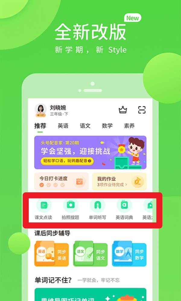 2. 登录成功后,在首页界面找到“课文点读”“单词听写”等功能入口,根据学习科目需求点击对应板块开始使用学习工具。