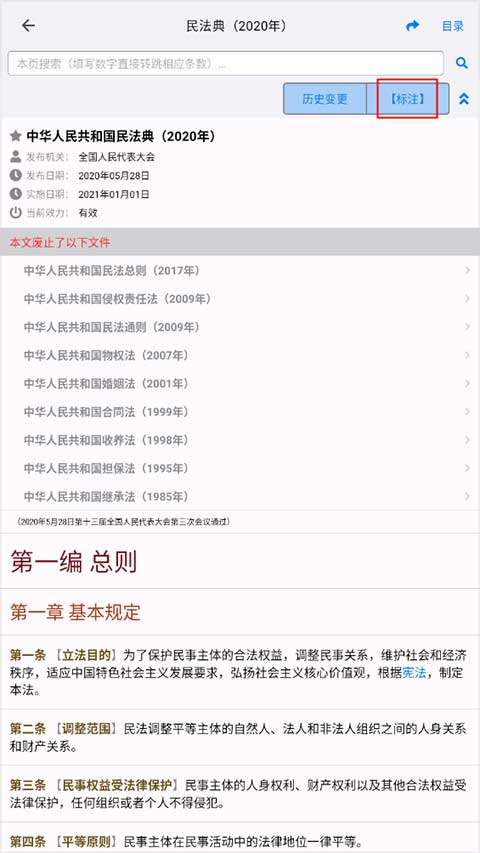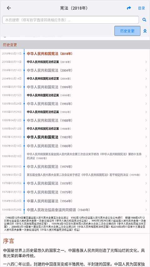 2、点击进入便能阅读,点击右上角“历史变更”,还能查看具体的变更年份与变更内容。