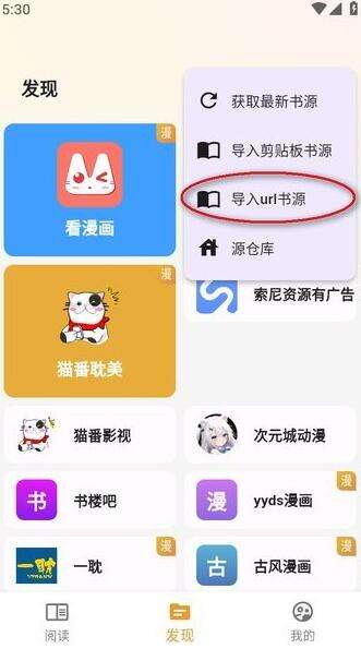 3、如果自动获取的图书来源不令人满意,请单击右上角的三次单击并选择“导入URL图书来源”手动导入图书来源。
