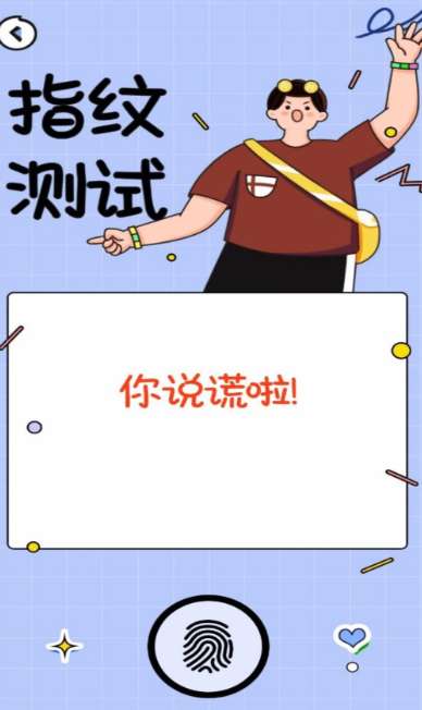 《测谎仪模拟器》是一款非常有趣好玩的模拟测谎风格的手机休闲小游戏。里面有两种方法:指纹和语言测量。它很容易使用。只需点击类型,并按照软件的提示。该软件也有真心话大冒险部分,所以用户不再需要担心意外的内容。而且,里面的问题都是随机的。在游戏中,玩家可以通过按压指纹区来测试对手谎言的真实性,非常有趣。