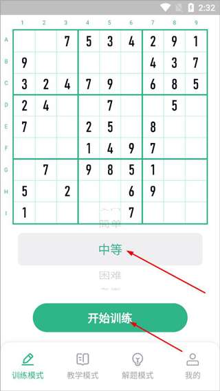 1、打开数独家app,有训练模式,教学模式、解题模式和我的,训练模式选择训练难度即可开始训练。
