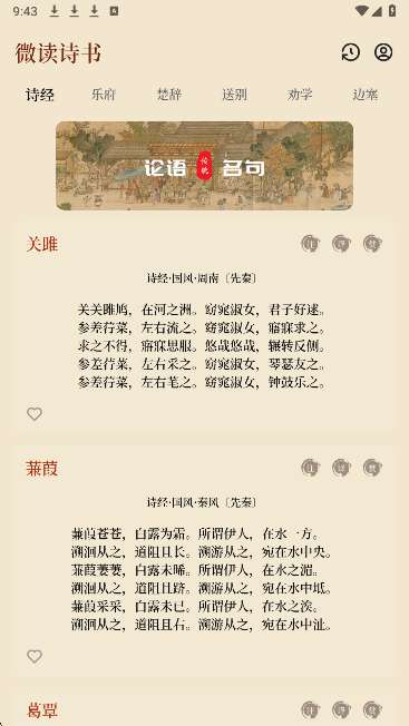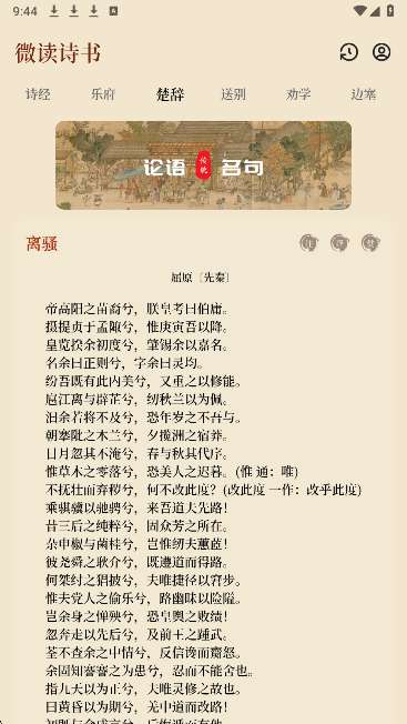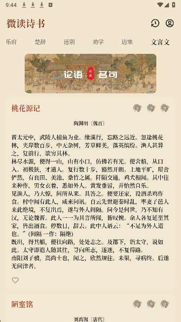 微读诗书软件收集古诗、文言等内容,建立多个古诗、文言栏目,所有喜欢古诗、文言的用户可以在线阅读更多经典内容,探索楚辞、乐府、诗经等多种内容,用户可以自主选择喜欢的古诗进行阅读和学习,不断掌握更多古诗的内容,微读诗书软件为每首古诗提供详细的译文和注释内容,原文、注释和分析相结合进行阅读学习,使古诗的意境和含义更容易阅读。微读诗书软件所给的古诗词赏析非常全面,观赏后可以充分理解古诗词的由来和特点。感兴趣的朋友不要错过下载微读诗书软件。