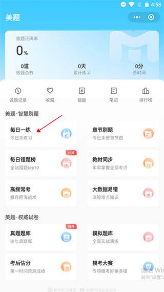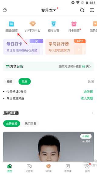 1、首先打开美好明天课堂app,在首页点击进入【美题/题库】。