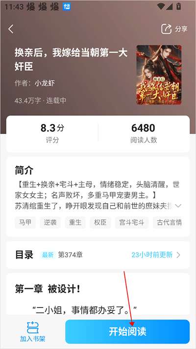 1、打开并进入小说阅读应用程序,选择一部小说并点击进入。