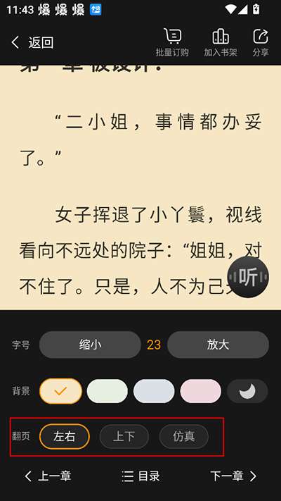 4、个性化设置:支持字体大小、背景颜色、翻页效果等自定义设置,满足用户个性化需求。