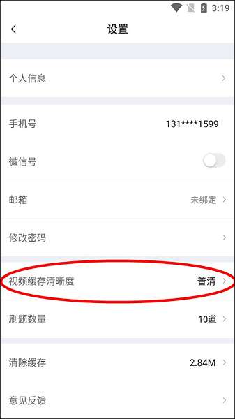 3、进入设置界面可以看见很多对我们使用这款软件都很有帮助的功能,例如修改密码、个人信息、设置刷题数量等功能,这个时候我们就点击刷题数量上面的视频缓存清晰度。