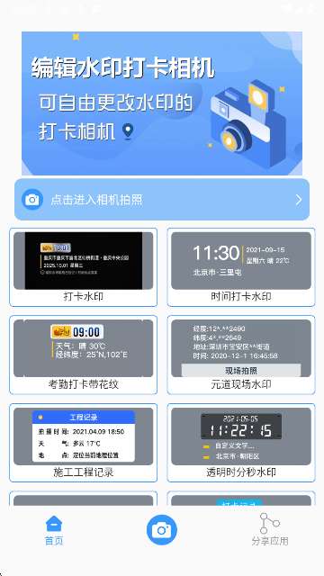 1、海量水印模板,应用多场景拍摄、打卡、记录、施工信息、时间地点、会议记录、宝宝成长记录等水印模板。