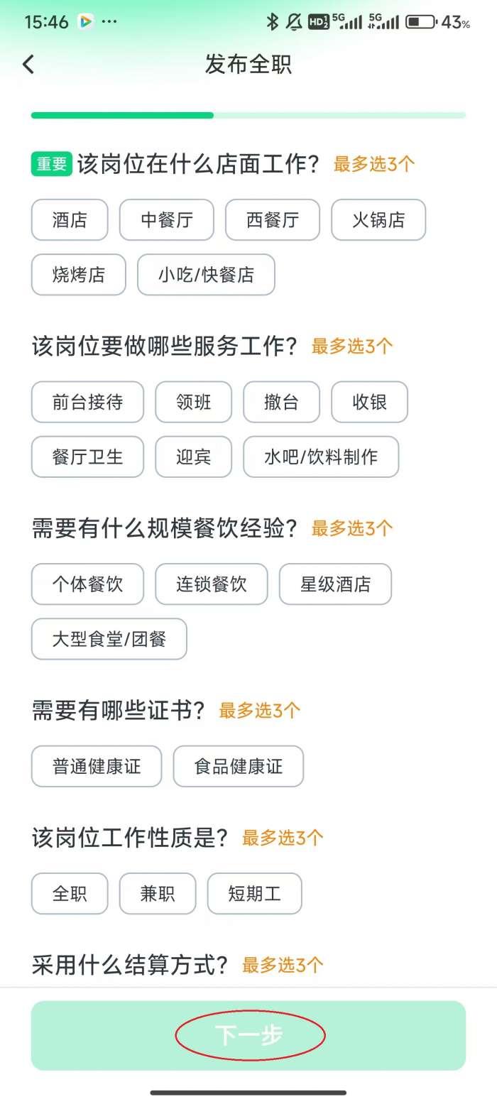 4、选择该职位的工作环境,内容等,随后点击屏幕下方的“下一步”。