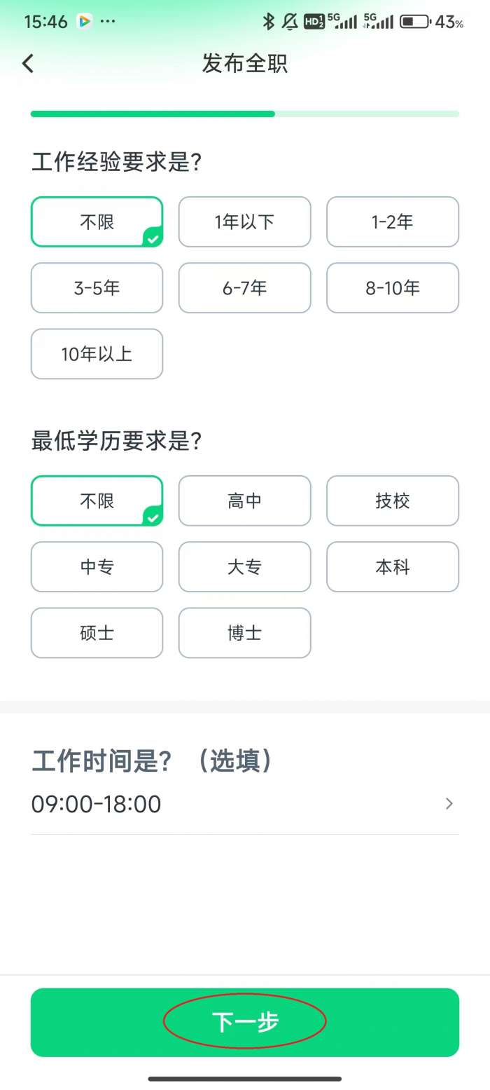 5、选择对求职者的要求,随后点击屏幕最下方的“下一步”。