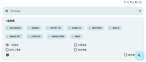 1.点选EhViewer首页的搜寻栏旁边的+号,开启过滤条件,点一下就能过滤掉该分类的结果,例如「Non-H」过滤普遍级内容。