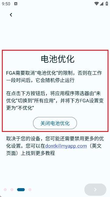 5、电池优化:FGA需要取消“电池优化”的限制,否则在工作一段时间后,它会随机停止运行在点击下方按钮后,将应用程序筛选器由“未优化"切换到“所有应用”,并将下方FGA设置变更为“不优化”。