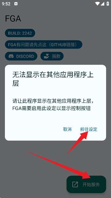 8、选好脚本功能之后点击开始服务,然后根据提示授予软件必要的权限,如图所示【请让此程序显示在其他应用程序上层,FGA需要启用此设定以显示控制按钮】。