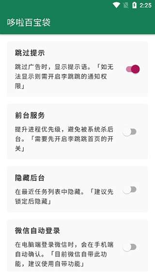 4、在“哆啦百宝箱”当中,能够看到软件的详细设置,包括跳过提示、隐藏后台。