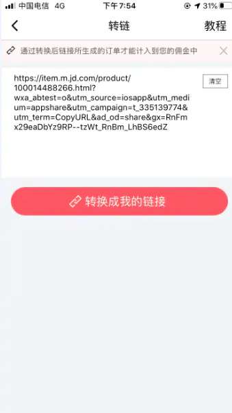 4、在打开的转链页面中将刚才的链接粘贴进去后点击【转换成我的链接】。