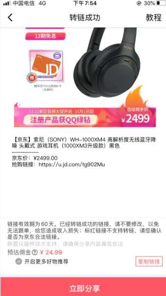 5、此时用户可以看到,转让完成后,将给出估计的佣金价格,用户点击页面底部【立即分享】,用户将商品分享到其它平台或者其他用户后就可以前往京粉app中的【佣金】页面中进行佣金提取。