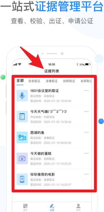 5、在“证据列表”中,可以统一管理所有取证与存证记录,支持查看、校验、出证及申请公证。