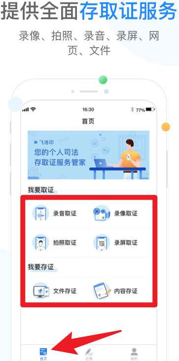 3、进入首页后,可以选择“录音取证、录像取证、拍照取证、录屏取证、文件存证、内容存证”等功能进行操作。