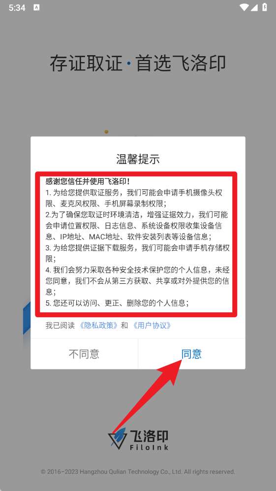 1、首次打开飞洛印时,请认真阅读并同意《用户协议》和《隐私政策》,点击“同意”进入。
