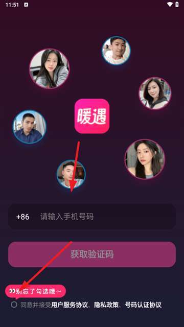 3、勾选同意用户协议和隐私政策,输入手机号获得验证码登录即可。