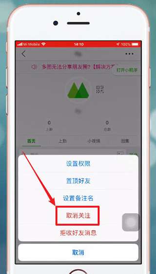 3、选择“取消关注”继续。