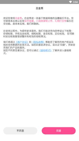 1、下载并安装打开白金秀app,阅读协议自行选择是否同意。
