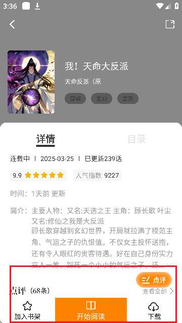 5、点击作品封面进入到详情页,如图所示,这里可以进行点评,加入书架或者下载。