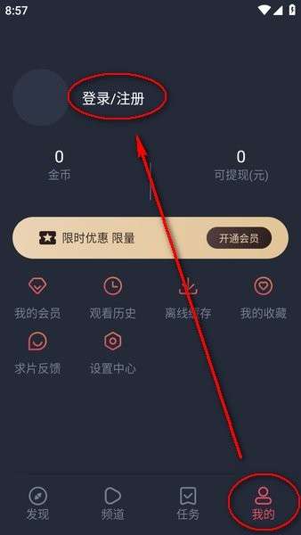 1、打开动漫共和国app后,点击右下角“我的”,头部有个“登录/注册”,点击进入。