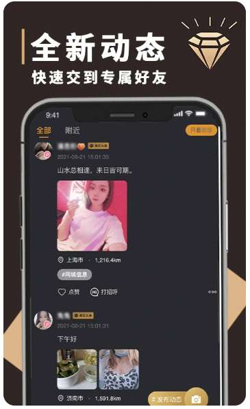 钻石圈带给你新式聊天交友体验,同城约社交聊天交友,面具公园式聊天交友,结识更有趣的陌生人。是偶遇附近缘分聊天交友平台,随时查看探探交友身边单身的小姐姐帅哥,极速闲聊。真人刷脸、实名认证、确保真实可靠,让我们来聊天交友吧!喜怒哀乐尽在掌握,附近秒约,告别“尬聊”,认识默往陌生人就这么简单。感兴趣的朋友不要错过下载钻石圈软件。