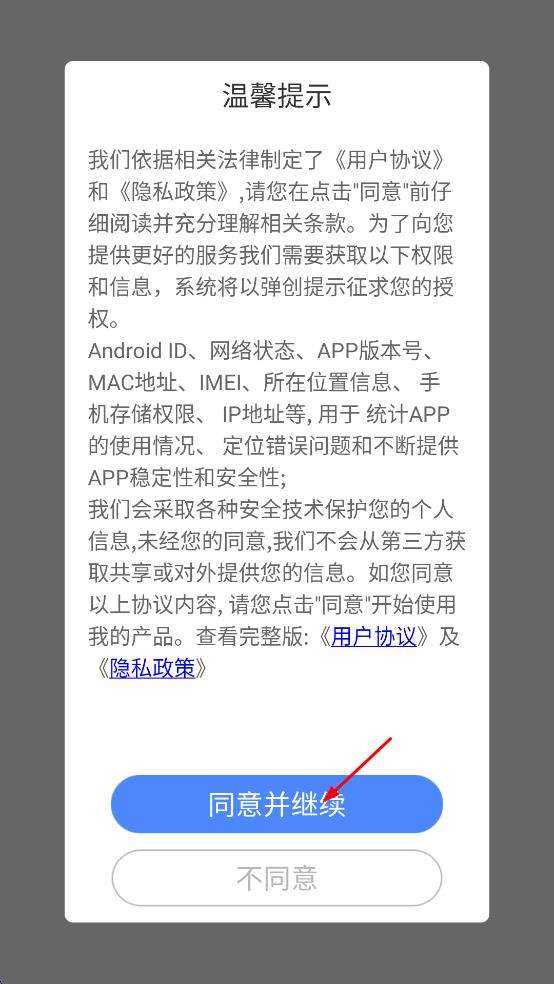1、打开滚动提词器应用,在温馨提示弹窗中,点击同意并继续按钮,进入主界面。