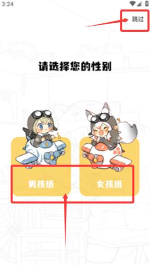 1、启动应用后,可在性别选择页面挑选偏好选项或直接跳过。