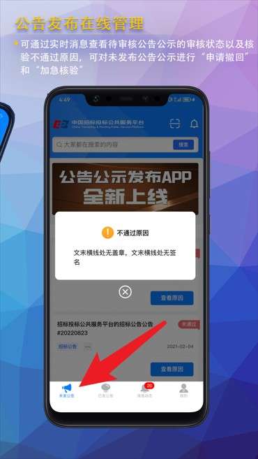 2、在系统公告可查看待审核公告状态,支持未发布公告申请撤回或加急核验处理。