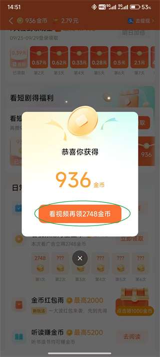 5、领取后,也可以通过点击“看视频”来再次获得金币。