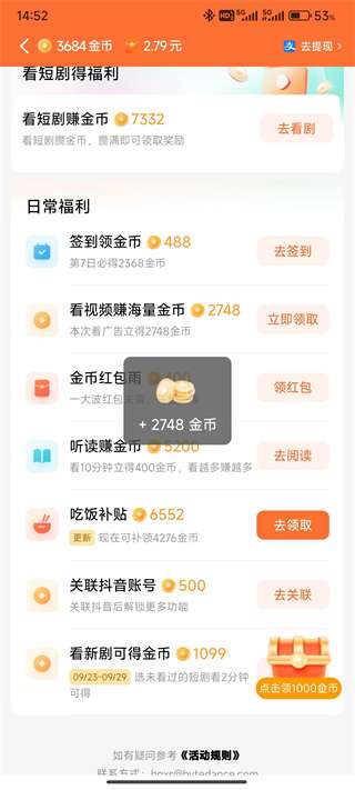 7、将屏幕向下滑动可以看到各种任务来获得金币。