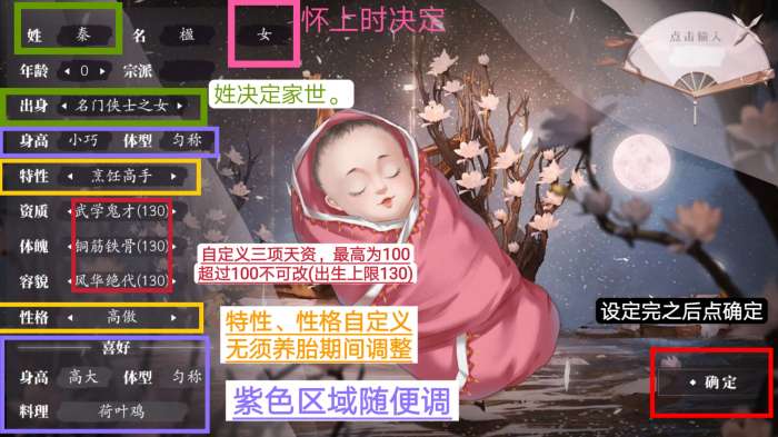 高级自定义下若未购入则孩子特性性格需sl+养胎培养,其余属性可在出生时sl。