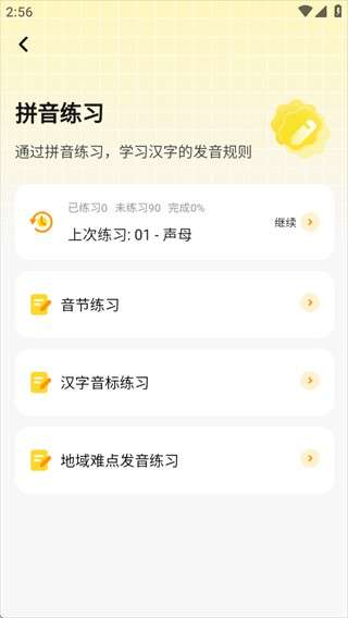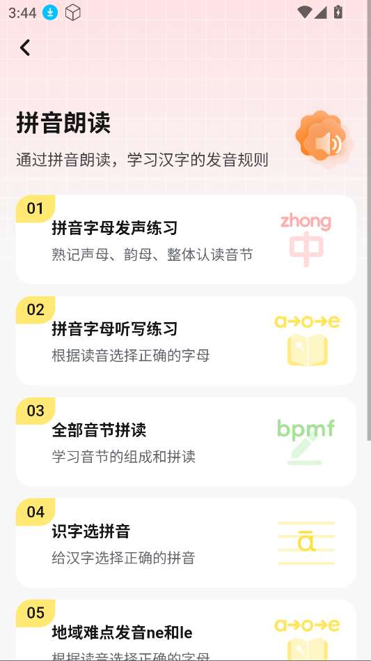 1、拼音发音学习模块涵盖了声母、韵母和整体识别,帮助用户打下扎实的拼音基础。